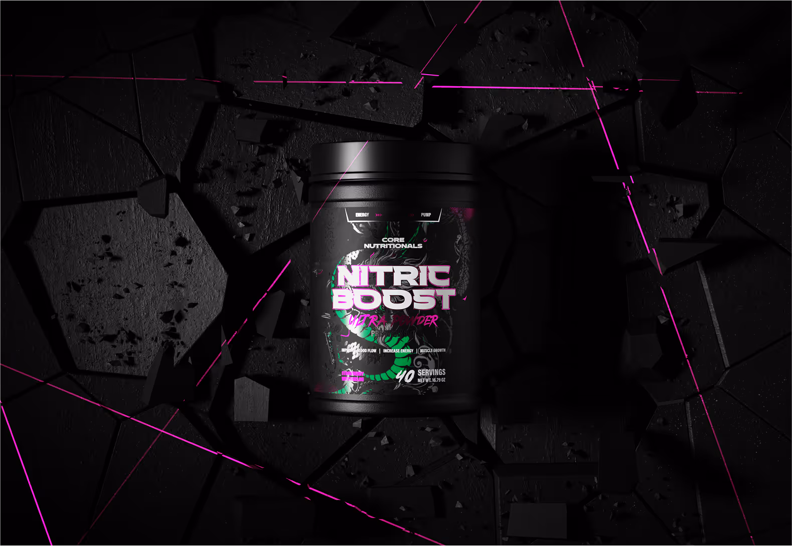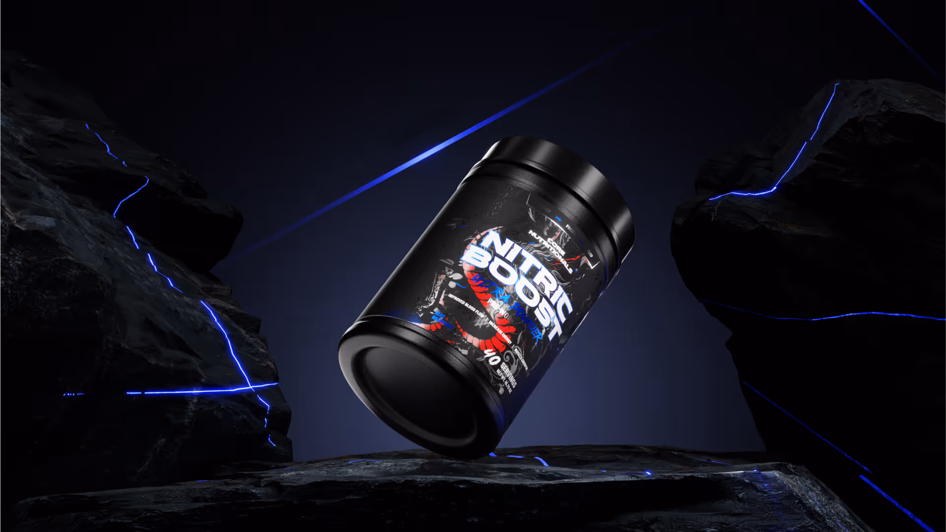 The design approach used bold typography, dark tones, and electric accent colors, giving the packaging a strong and motivational feel. We then created photorealistic 3D renders, showcasing the tubs and pouches under dramatic lighting to emphasize texture, detail, and energy.